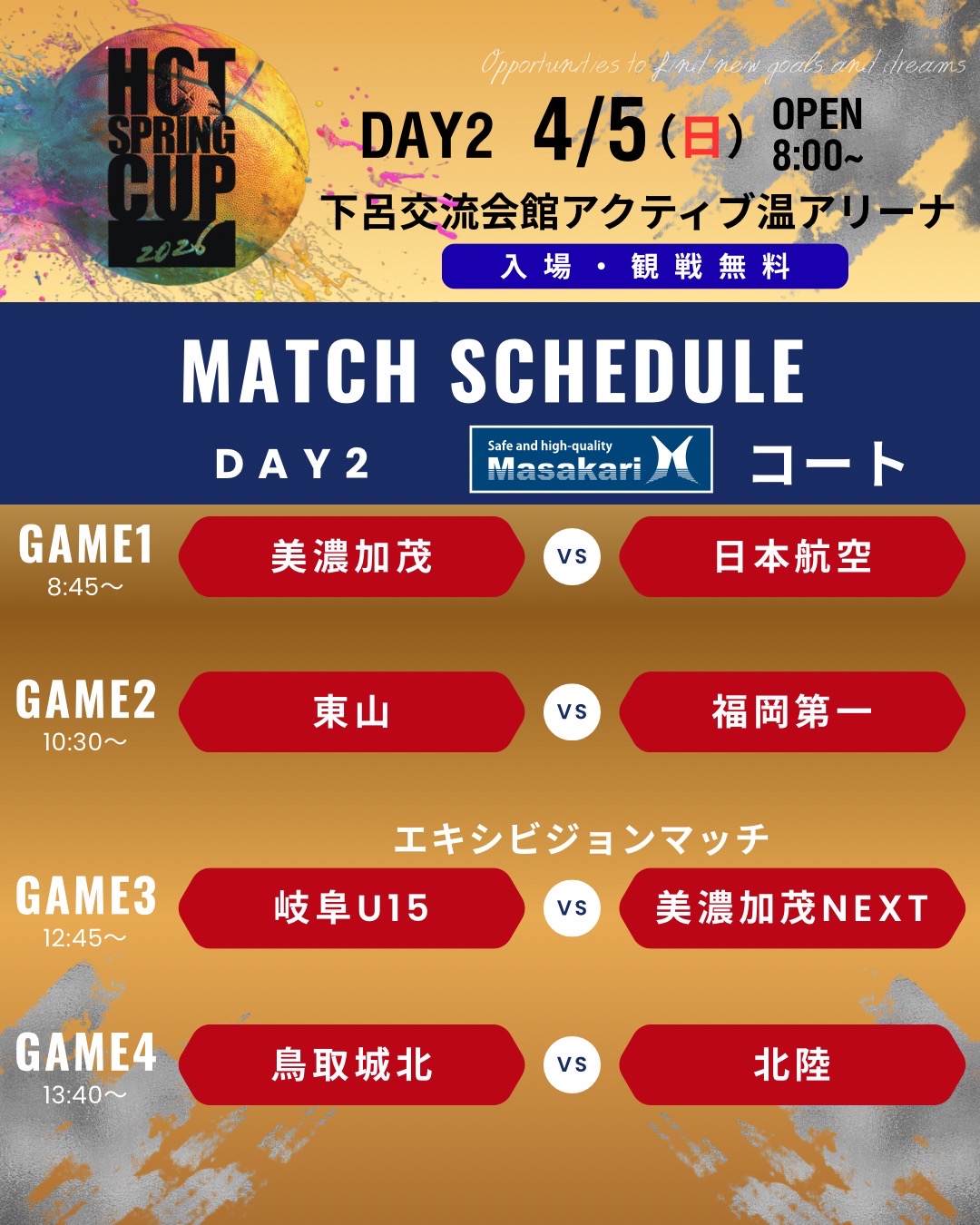 Hot Spring Cup 2026.04.05 HOT SPRING CUP2026 順位決定戦の組み合わせ。 昨日は多くの皆様にご来場いただき、誠にありがとうございました。 本日は順位決定戦を行いますので、組み合わせを発表させていただきます。 ご来場の際は、お気をつけてお越しください。